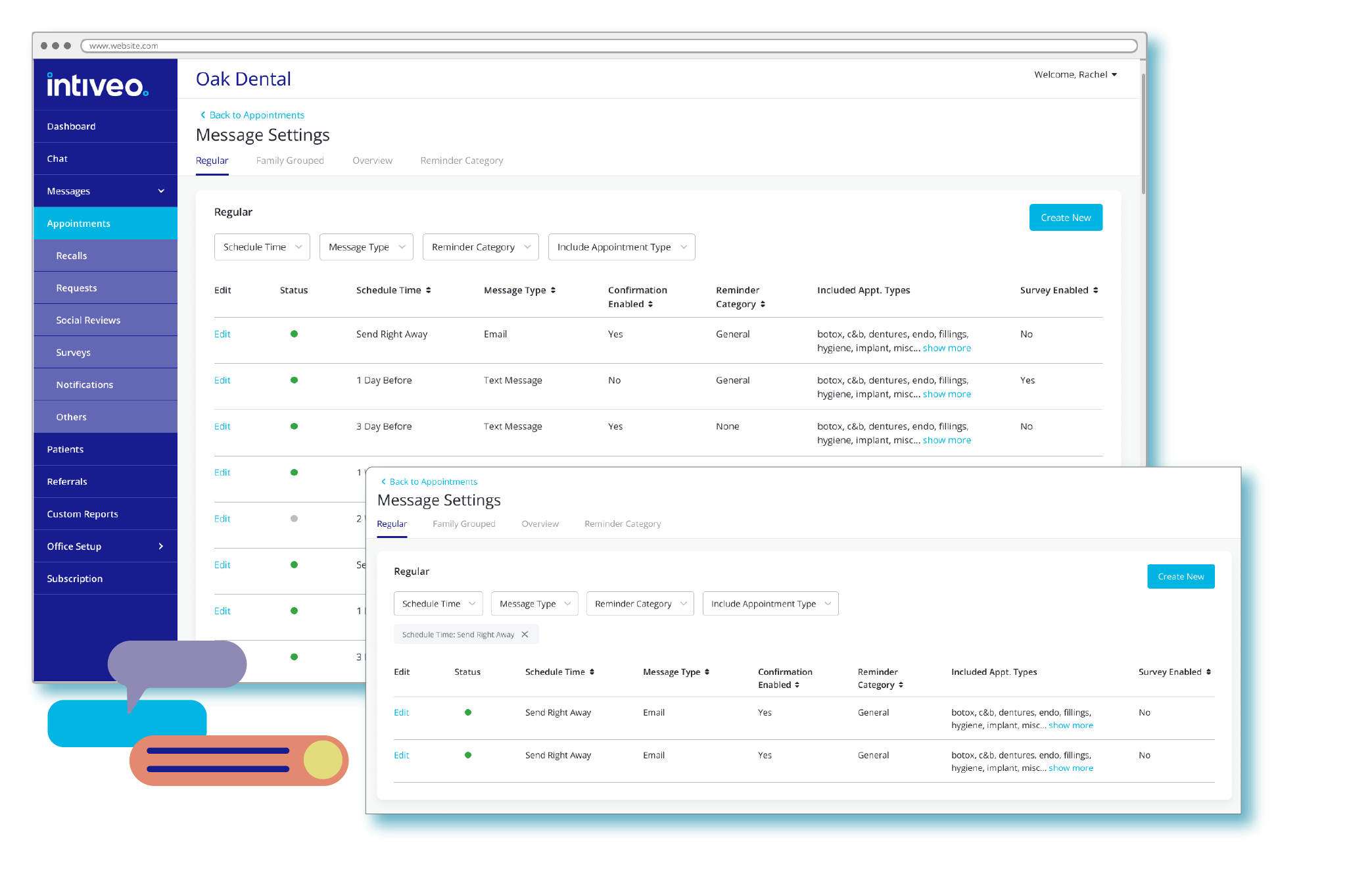 Intiveo lets you customize communication by appointment type. Whether it’s routine cleaning, implant surgery or a pediatric visit, patients receive information that’s specific, relevant, and easy to follow before and after their appointment.