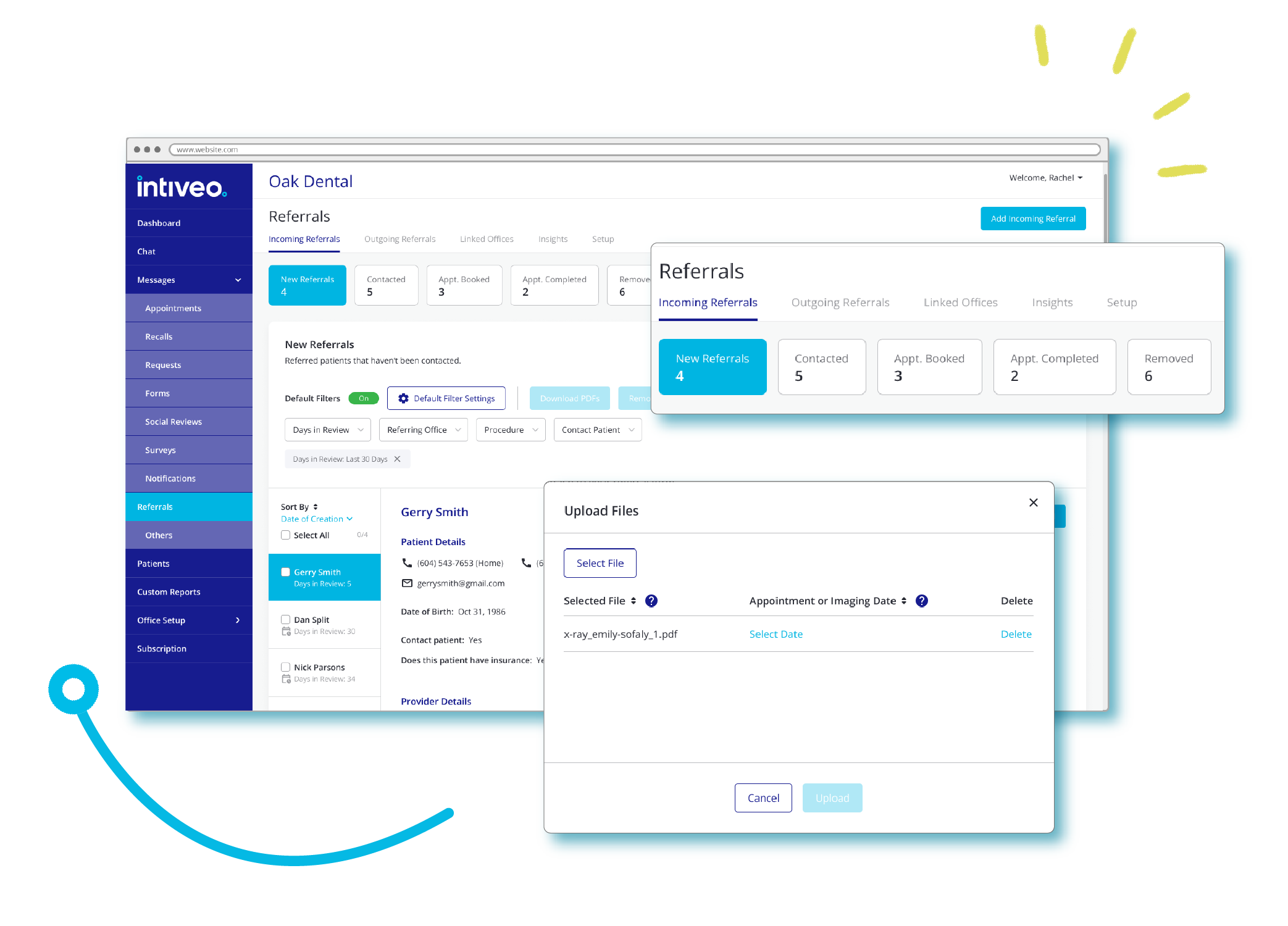 - Denise Davis, Administrator Lead at Oral Surgery and Implant SpecialistsWhether it’s sending patient information to a specialist or receiving incoming referrals, you can manage everything in Intiveo. Exchange notes, manage attachments, and allow both practices to stay updated on every patient’s progress.